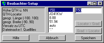 Diese Aufnahme zeigt das Menü 'Beobachter-Setup, in dem benutzerspezifischen Einstellungen (Standort, Versatz der lokalen Zeit gegenüber UTC, usw., eingegeben werden können.