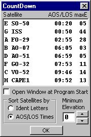 The "Countdown" window allows to quickly overview the next satellite passes (the window should be positioned outside the SatPC32 main