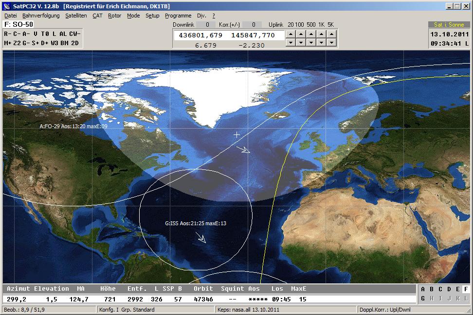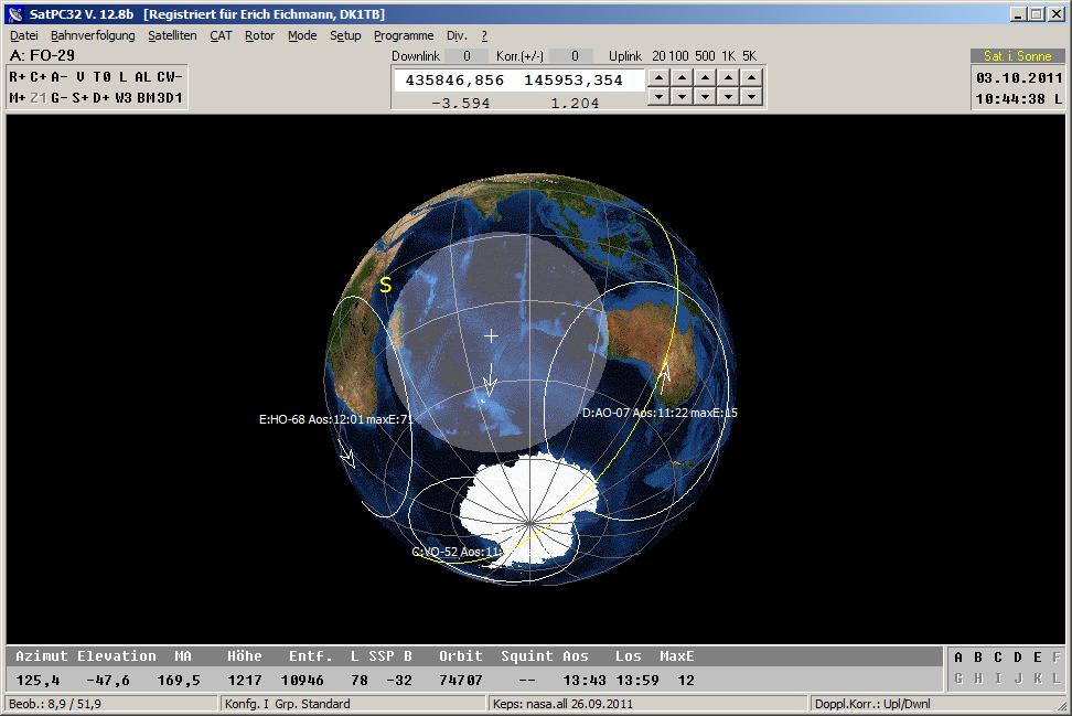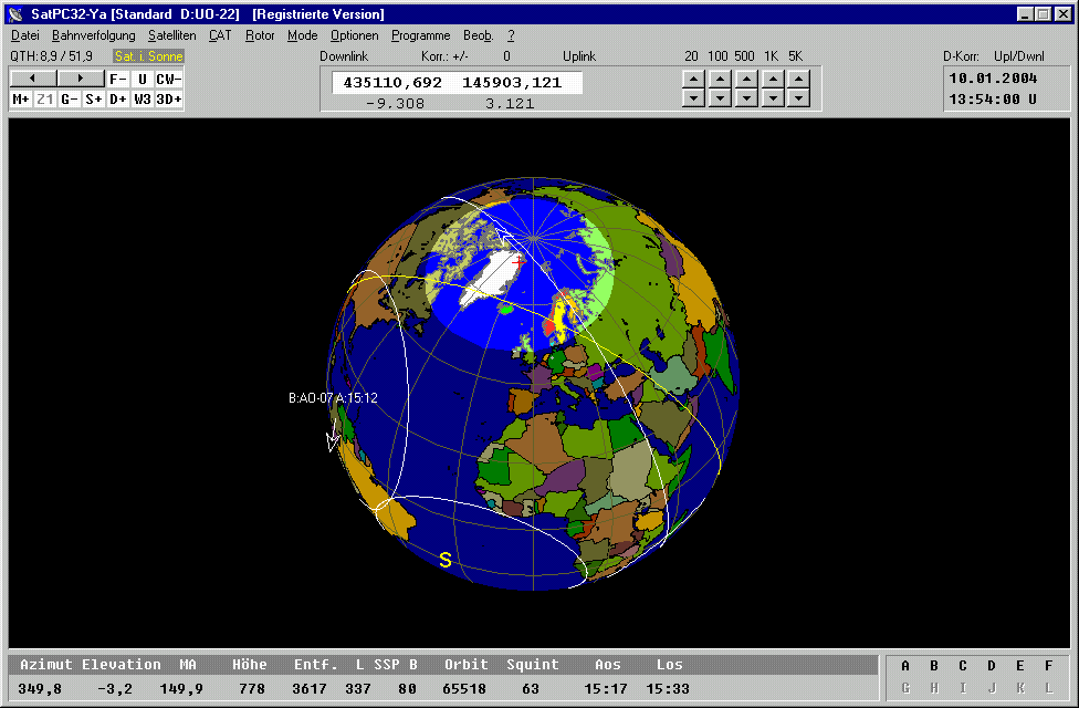 werden die Namen und Aufgangszeiten eingeblendet. Die gelbe Linie zeigt die Sonnenlinie an, anhand derer man erkennt, ob der Satellit sich im Sonnenlicht befindet oder im Erdschatten (Eklipse). UO-22