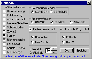 Im Menü 'Optionen' können die Vorgaben für den Programmstart festgelegt werden und die grafischen Darstellungen des Programms vorgenommen werden. Es kann zwischen 3 verschiedene Fenstergrößengewählt werden. Bei derOption 800 * 600 z.B. füllt das Programm bei einer