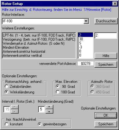 Im vorstehend abgebildeten Menü 'Rotor-Setup' können alle für die Rotorsteuerung erforderlichen Einstellungen vorgenommen werden. Die von SatPC32 unterstützten Rotor-Interfaces und -Controller können aus einer Liste ausgewählt werden. Um die Liste einzublenden, klickt man auf die kleine Schaltfläche rechts neben dem obersten weißen Feld.