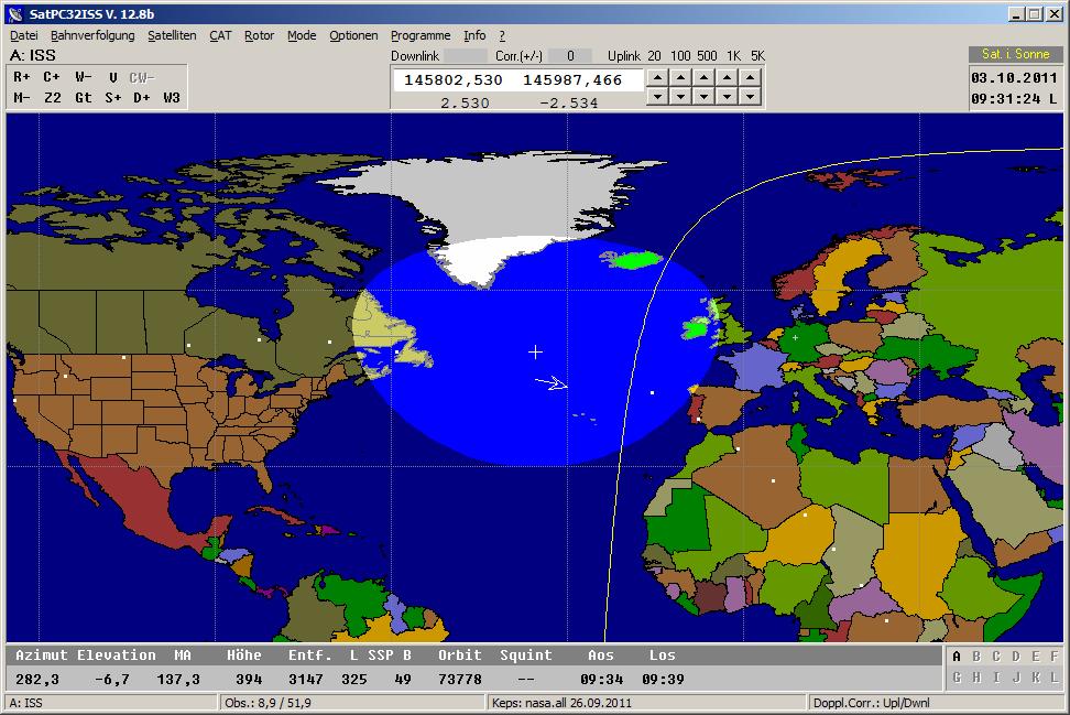 Bildschirmaufnahme von SatPC32ISS. Diese im Lieferumfang enthaltene Spezial-Fassung von SatPC32 ermöglicht mit gängigen Funkgeräten eine Frequenzsteuerung bei Amateurfunkverbindungen mit der ISS. Im Gegensatz zu anderen Satelliten liegen bei der ISS Uplink- und Downlink-Frequenz im selben Band. Die Normalfassung von SatPC32 kann für "In-Band"-Betrieb nicht verwendet werden. Sie schaltet die Funkgeräte in den Satelliten-Modus, um gleichzeitiges Empfangen und Senden (Full-Duplex) zu ermöglichen. Deshalb müssen beim Satelliten-Modus Uplink und Downlink notwendigerweise in verschiedenen Bändern liegen. SatPC32ISS verwendet deshalb den Split-Modus (Halb-Duplex).