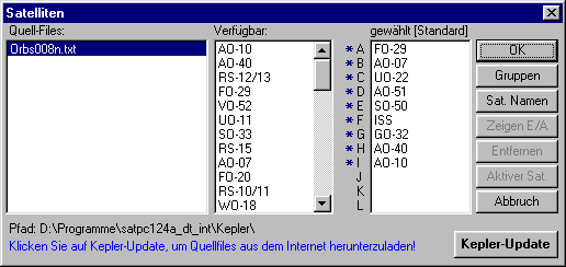 Die Grafik zeigt das Menü 'Satelliten' des Programms SatPC32. Ist ein neues Quellfile mit Keplerdaten verfügbar, wird es in der