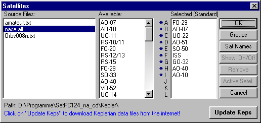Menu 'Satellites' of SatPC32 . When a new source file with Keplerian data is available, it will automatically be displayed in the left list. Clicking on the filename will select the new file for further calculations.