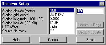 The screenshot shows the setup window for user data. The location can be entered either by longitude/latitude or the 6-digit locator.