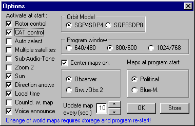 This screenshot shows the menu 'Options'. The user can select whether some of the most important options shall be on or off at program start. The "Zoom 1" world maps can be centered either on the satellite, the user's location or on Greenwich (longitude 0). Also, the user can choose 3 different sizes for the program window. With the option 800 * 600, i.e., the program fills the screen at a screen resolution of 800 * 600.