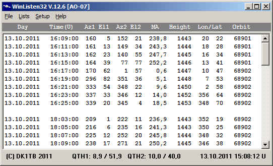 The screenshot shows the main window of WinListen. The program allows also to calculate the "window" for 2 observers. The observer locations can be entered either by their geographical coordinates or their locators.